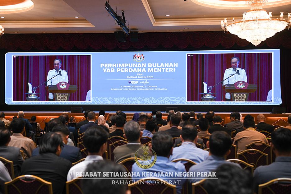 IPOH, 5 JANUARI 2026- YAB Dato’ Seri Saarani bin Mohamad, Menteri Besar Perak telah menghadiri Majlis Perhimpunan Bulanan dan Amanat Tahun Baharu 2026 YAB Perdana Menteri Malaysia secara dalam talian bersama lebih 300 orang penjawat awam negeri Perak di Dewan Bankuet, Bangunan Perak Darul Ridzuan, di sini.