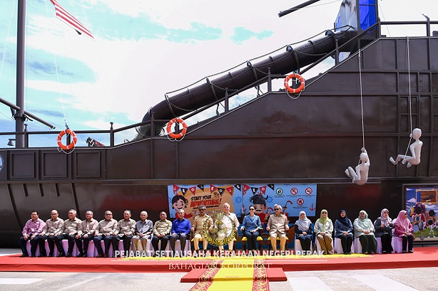 After that session, His Royal Highness proceeded to witness a maritime demonstration by the Royal Malaysian Navy Special Forces (PASKAL), the Marine Police, the Malaysian Fire and Rescue Department (JBPM), and the Malaysian Fisheries Department at the Perak River.